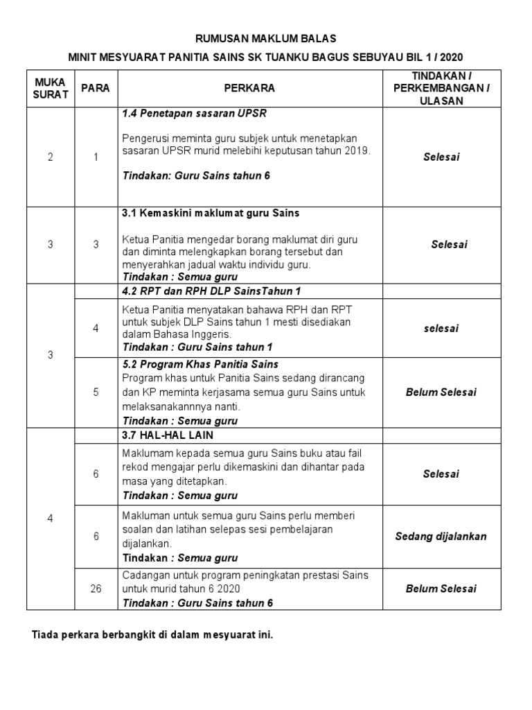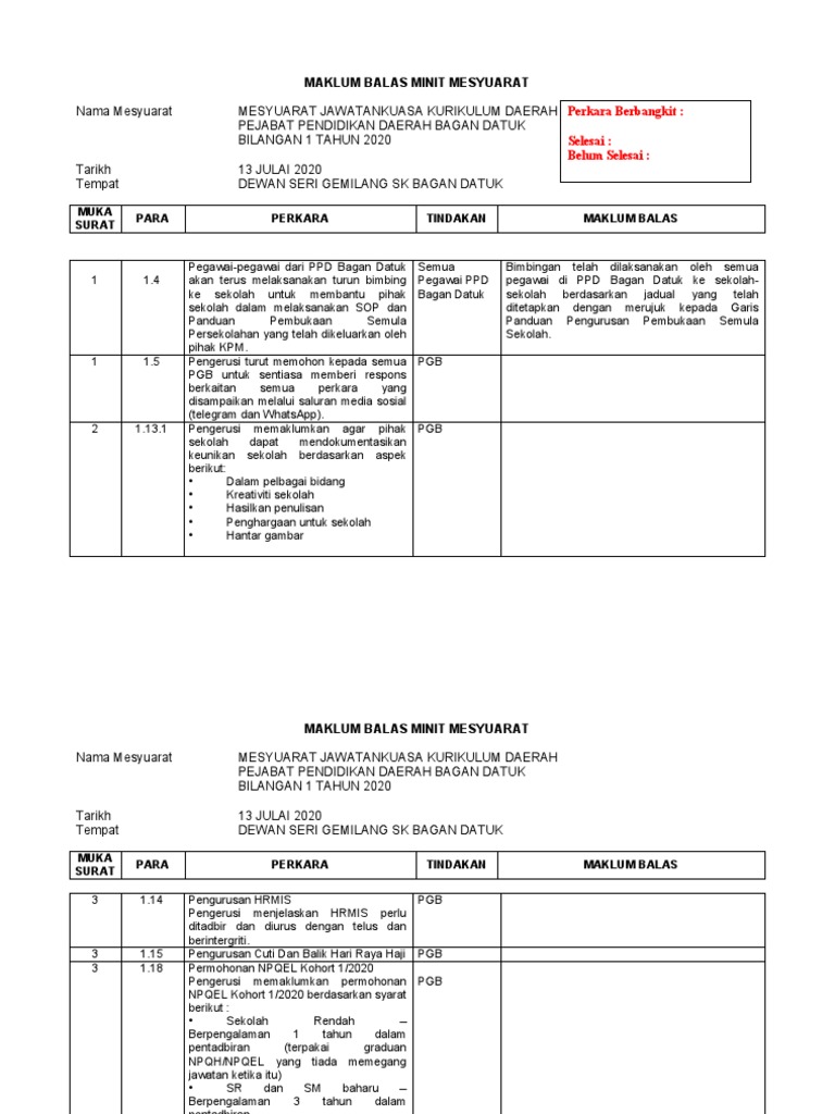 MAKLUM BALAS MINIT MESYUARAT GURU BIL22020 Published on Dec 9 2020 MAKLUMBALAS. Sign in to add files to this folder. Berikut adalah bahan Mesyuarat Jawatankuasa LINUS20 Bilangan 1 bagi tahun 2018 yang telah dijalankan pada 20 Februari 2018 Selasa yang lepas.