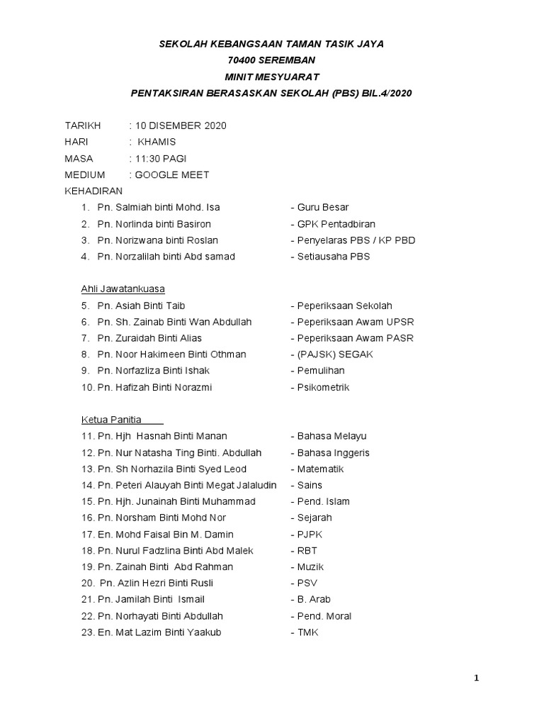 Ini adalah contoh minit mesyuarat pengurusan sekolah yang mengikut format spsk mac 2012 jabatan pendidikan negeri johor darul takzim yang terletak di johor bahru di malaysia. SK Parit Kemang tahun Minit Mesyuarat untuk mengesan 2021 Bidang pencapaian murid. 900 PAGI Tempat.